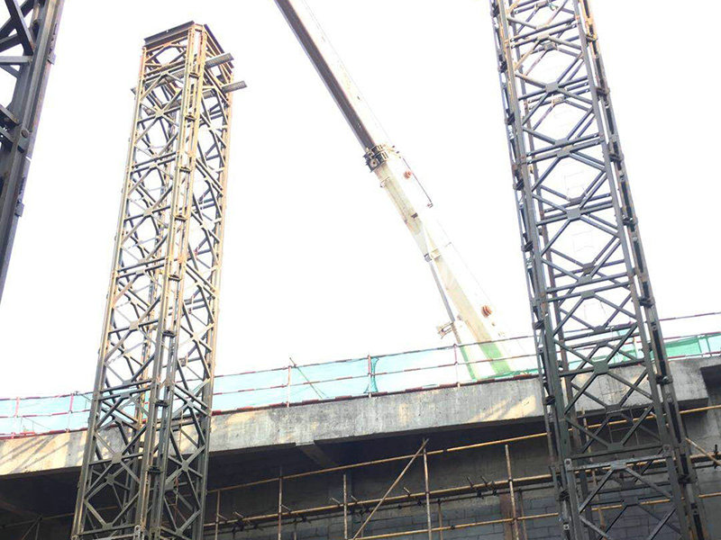 基本情況:部分構(gòu)件工廠組裝好,分片運(yùn)輸至現(xiàn)場(chǎng)。采用4片321型貝雷片組合而成的貝雷方柱作為大跨度鋼桁架下部的臨時(shí)支撐胎架,待上部鋼桁架安裝完成后分級(jí)卸載,最后分片拆除。拆卸后鋼桁架撓度符合要求。貝雷方柱支撐胎架高度達(dá)20m,支撐荷載約50t。